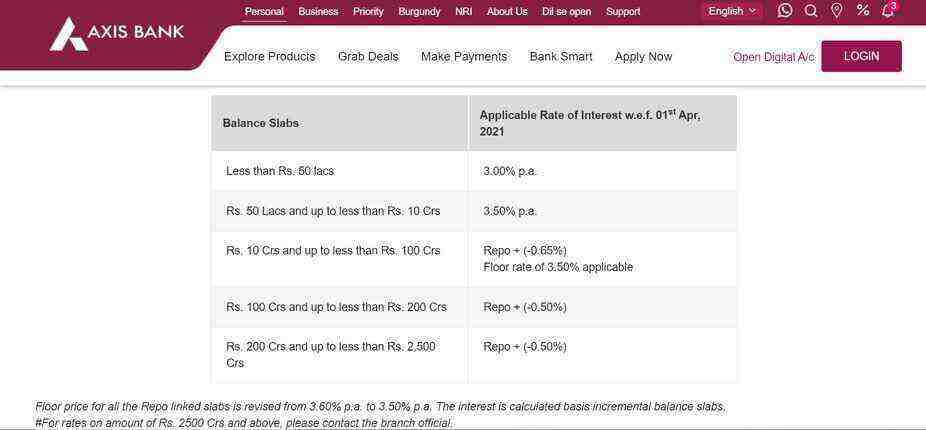 Axis Bank Saving Account interest rate:-