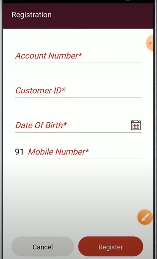 जैसा कि आप इंटरफेस में देख रहे हैं कि मोबाइल बैंकिंग रजिस्ट्रेशन पेज खुल चुका है जिसमें आपको अकाउंट नंबर कस्टमर आईडी डेट ऑफ बर्थ साथ में मोबाइल नंबर भी इंटर करना है। फिर आपको Register बटन पर क्लिक कर देना है।