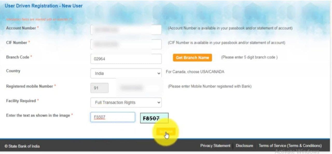 - As soon as you do for you, you will open such an interface in which you will be asked to fill- Account number, CIF number, branch code, country, register mobile number, facility required, enter the text in image. You have to click on submit button.