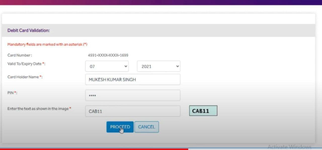 - इसमें आपको डेबिट कार्ड का एक्सपायरी डेट, कार्ड होल्डर, एटीएम पिन और कैप्चा कोड इंटर करने के बाद प्रोसीड बटन पर क्लिक कर देना है।